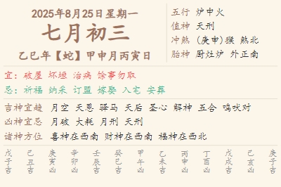 2025年8月25日黄历 时辰吉凶格局