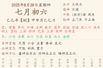 2025年8月28日黄历 时辰吉凶格局